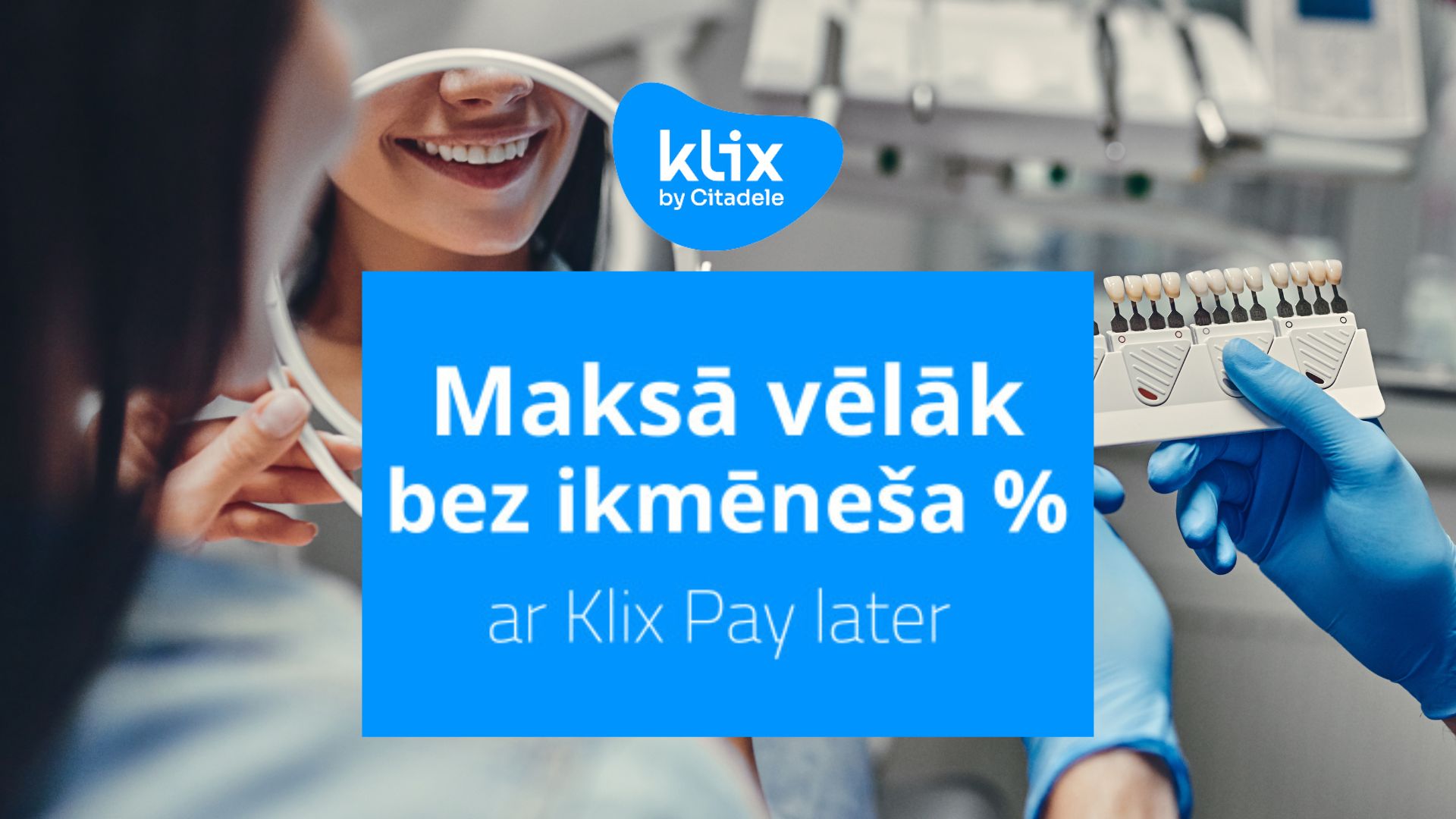 Klix Pay later ir uzticama pakalpojumu apmaksas metode, ko izstrādājusi AS “Citadele banka”, lai nodrošinātu pilnībā attālinātu, drošu un ātru aizdevuma noformēšanu. Tas ļauj klīnikas pacientiem veikt apmaksu par zobārstniecības pakalpojumiem, noformējot aizdevumu bez ikmēneša %.
